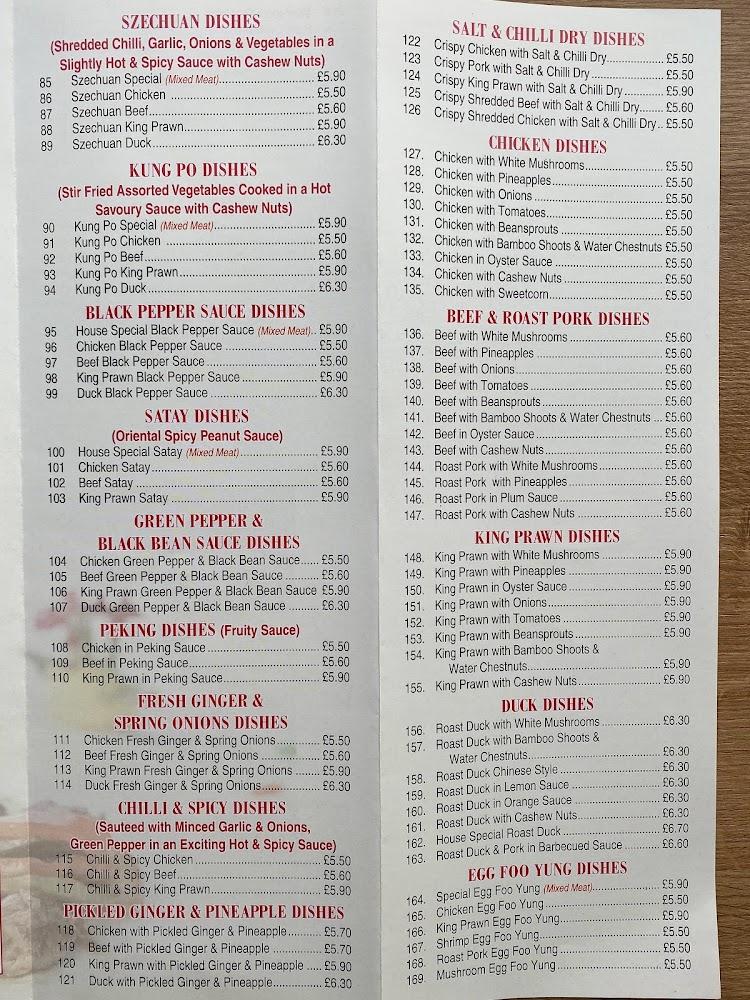 The menu at New World is a treasure trove of authentic Chinese flavors, featuring over 70 different dishes that cater to every palate. Highlights include the mouth-watering egg fried rice and a plethora of curry options like the house special curry and chicken curry, known for their rich flavors. There's also a variety of meats from king prawn to beef, offering exciting dishes such as Szechuan chicken and Kung Po king prawn. For those looking for something different, the menu includes Malaysian Sa Cha dishes, savory mushroom in black bean sauce, and an array of pickled ginger and pineapple dishes. Vegetarians and meat-lovers alike can enjoy delicious appetizers like crispy pancake rolls and house platter. The robust selection guarantees that there's something for everyone, whether you're after a classic dish or exploring new flavors.